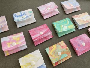 先日みんなが作ったマーブリング作品を使って、自分だけの“オリジナル財布”を完成させました。色とりどりの模様がとてもきれいで、同じ色の絵の具を選んでいても全く違う個性豊かな財布に仕上がりました。