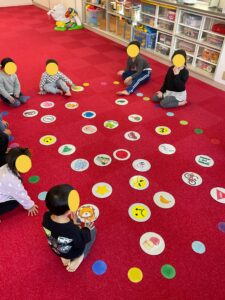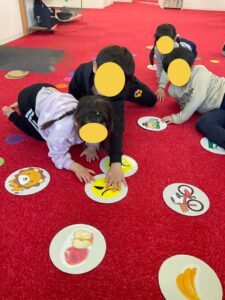 ゲームが始まると、なんのカードが出てくるか子どもたちは一斉に職員の方に注目!みんなの熱い視線の中カードを出すと、目線はすぐに床のカードに移り真剣な表情でカードを探していました。