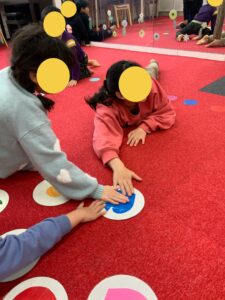 職員が提示するカードと同じカードを、床いっぱいに広げた中から探し出すゲームです。