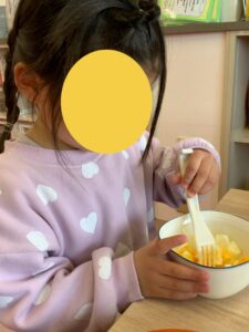 「コンコンと卵にひびを入れてからむくよ」とやり方を伝えると、生卵のイメージが強い子どもたちはとても慎重に、小さな力でコツコツとしていて、殻を剥くには足りないひびしか入りませんでした。