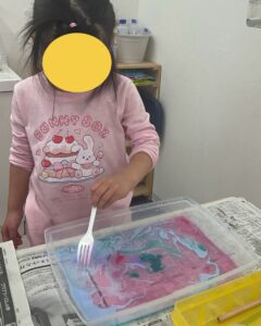 微細運動の向上 絵の具を垂らす量の調整や、フォークでの繊細な動きが手指のコントロールにつながります。