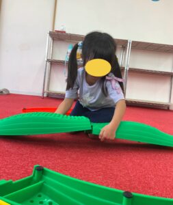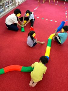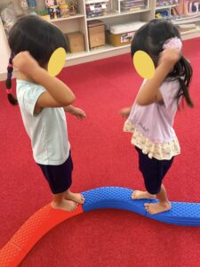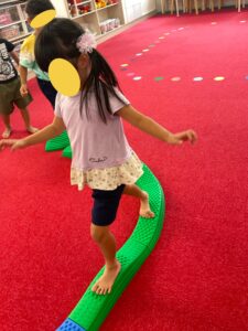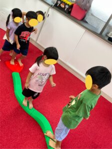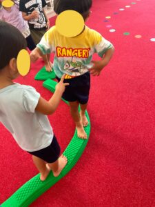 バランスブロックで一本橋を作るところから子ども達にやってもらいました。