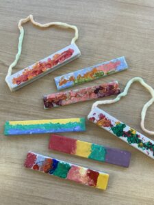大人はついつい、どうやったら綺麗になるかな?と考えすぎてしまいますが、子どもたちは自由に絵の具を重ね、個性豊かな作品がたくさんできました。