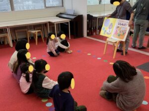今回は大型絵本を見ながら地震が起こった時に取るべき行動など、子どもたちに分かりやすいように伝えました。